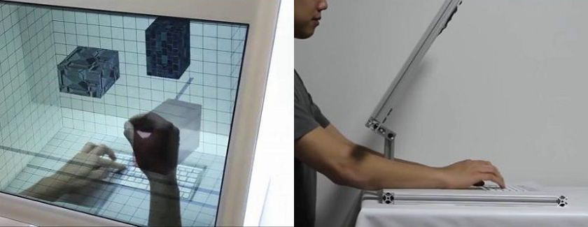 SpaceTop 3D 桌面是一个虚幻的“盒子”环境,由透明LED、两个摄像头构建而成。这两个摄像头可以识别用户的手势,同时还能追踪用户的眼球运动,随用户所见方向调整3D盒子中的界面角度。而用户的手则在LED后方,进行键盘输入、或在虚拟3D环境下做手势“抓取”操作等等。